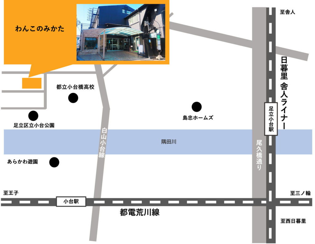 都電荒川線/小台駅から徒歩13~15分ほど 小台橋を渡った先、都立小台橋高校の裏手にあります ※3枚の大きなガラス戸、一番左側からお入りください